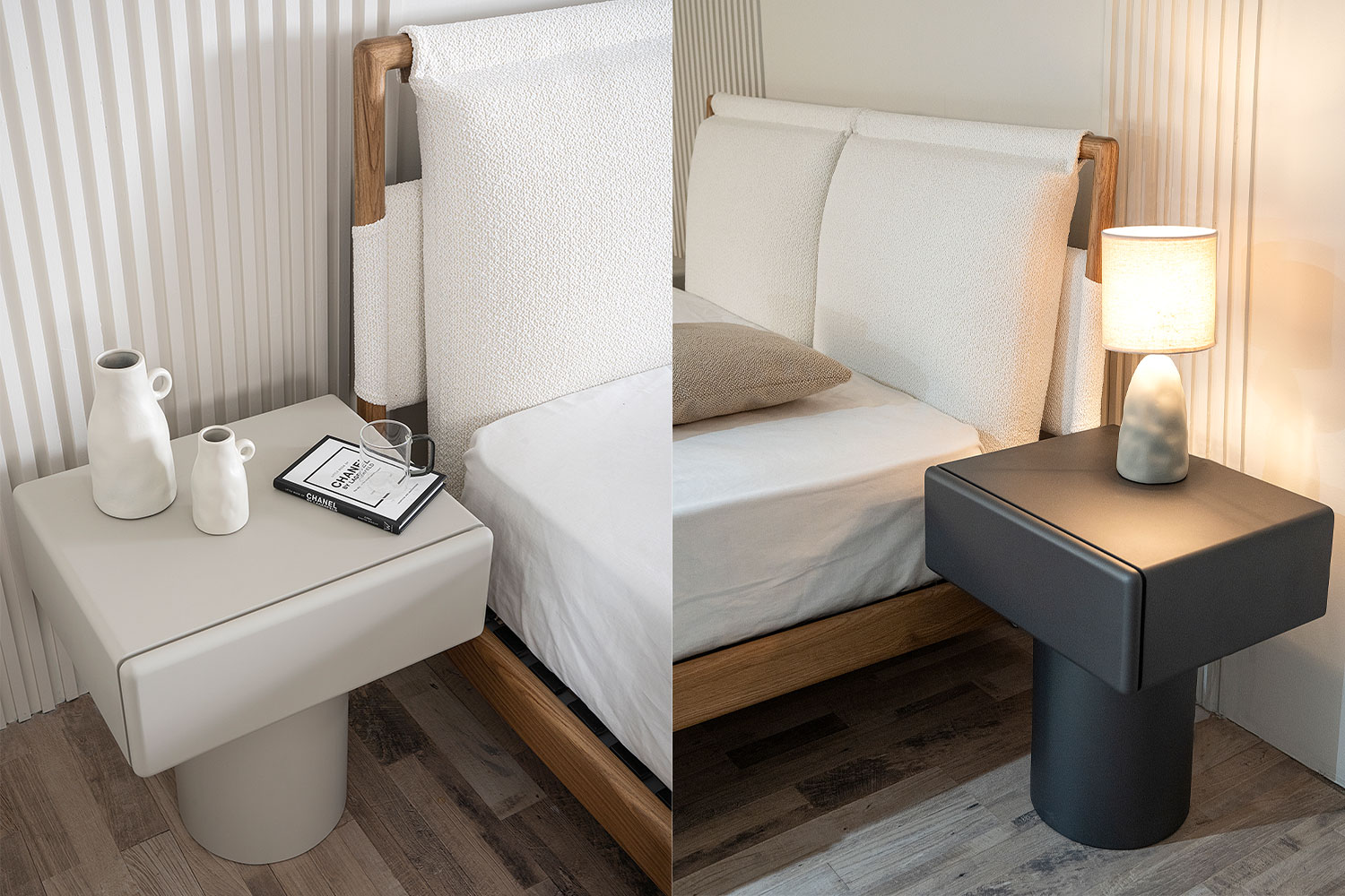 Το κρεβάτι Bliss, κατασκευασμένο από μασίφ ξύλο δρυός, σε συνδυασμό με το κομψό ύφος των κομοδίνων, προσδίδουν μια μινιμαλιστική νότα στο δωμάτιο σας.