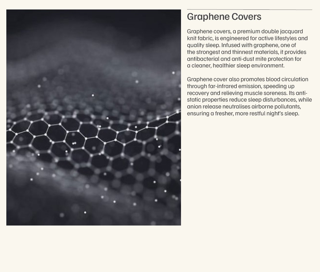 Το κάλυμμα του στρώματος, εμπλουτισμένο με Graphene, είναι σχεδιασμένο για όσους έχουν ενεργό τρόπο ζωής και δίνουν προτεραιότητα στην ποιότητα ύπνου.